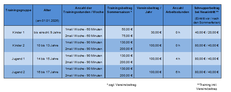 Trainingsbeiträge Kinder- und Jugendtraining im Sommer (Stand: 2026)